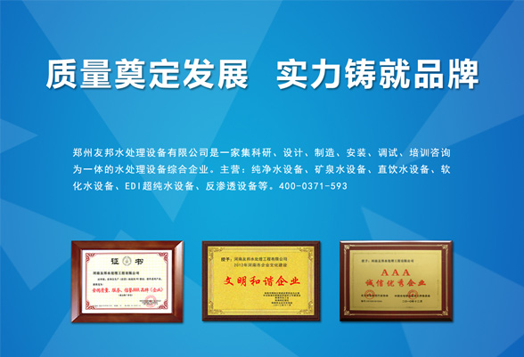 鄭州友邦水處理設備有限公司始創(chuàng)于2003年。自成立以來,友邦始終堅持以“客戶利益為保障”的原則,打造友邦口碑,備受客戶的認可和信賴。鄭州友邦是一家專業(yè)從事水處理技術開發(fā),設備制造生產(chǎn)及銷售的企業(yè)公司。嚴格的生產(chǎn)管理系統(tǒng)環(huán)環(huán)相扣,層層把關。從原材料選購到現(xiàn)場調(diào)試安裝,鄭州友邦重視每個細節(jié)。公司以堅持技術創(chuàng)新、質(zhì)量創(chuàng)優(yōu)、服務創(chuàng)佳的原則,以優(yōu)質(zhì)的產(chǎn)品和專業(yè)的服務實現(xiàn)我們的承諾:把您擁有的水變成您需要的水!
